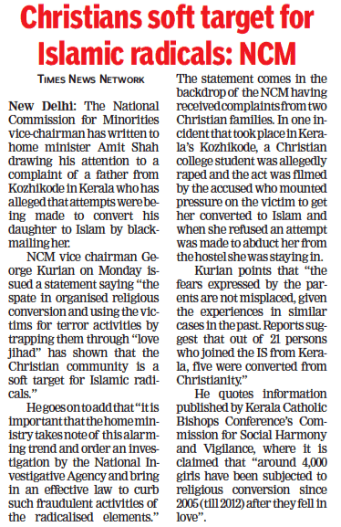 जॉर्ज कुरियन ने कहा कि ईसाई लड़कियाँ ‘लव जिहाद’ का सबसे आसान शिकार बन रही हैं। उन्होंने गृह मंत्रालय से इस ख़तरनाक चलन को रोकने और इस मामले में एनआईए से जाँच कराने की माँग की। बकौल अल्पसंख्यक आयोग, ईसाई लड़कियाँ इस्लामिक कट्टरवादियों के लिए एक ‘सॉफ्ट टारगेट’ बन गई हैं। आयोग ने कहा कि अब इस्लामिक कट्टरपंथियों द्वारा चलाए जा रहे धर्मान्तरण अभियान को रोकने के लिए क़ानून बनाने का समय आ गया है। कुरियन ने कहा:“कई अभिभावकों में ‘लव जिहाद’ को लेकर डर का माहौल है और उनका ये डर जायज भी है। पूर्व में कई मामले ऐसे आ चुके हैं, जहाँ ईसाई लड़कियों को ‘लव जिहाद’ का शिकार बनाया गया। केरल के 21 लोग खूँखार वैश्विक आतंकी संगठन आईएसआईएस में शामिल हो गए। इनमें से 5 ऐसे थे, जो पहले ईसाई थे और बाद में उन्हें धर्मान्तरण के जरिये इस्लाम कबूलवाया गया था।”