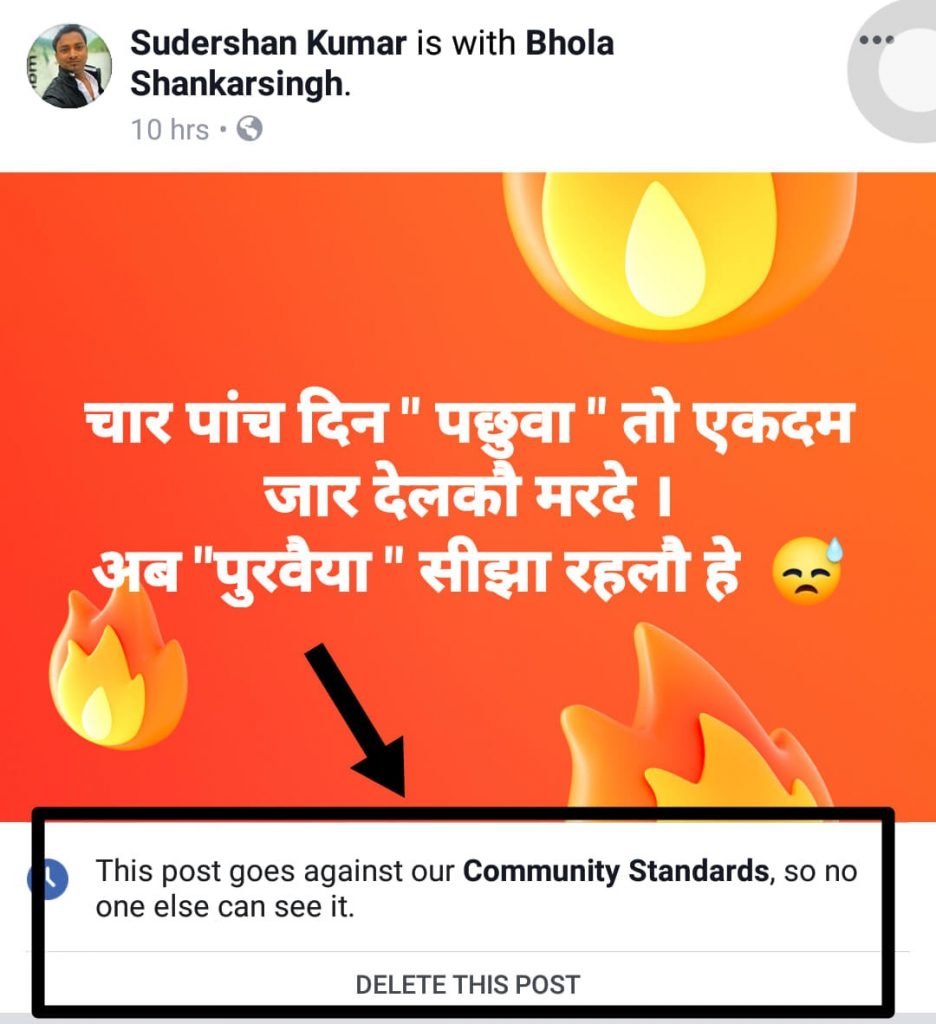 फेसबुक के आला अधिकारियों से बात करने की कोशिश की तो मुझे कहा गया कि पोस्ट हटा लीजिए। हमने हटा लिया। मेरा सवाल उनसे यह था कि अगर फेसबुक को लगा कि इस तस्वीर में दिक्कत है, तो एक बेहद अस्पष्ट भाषा में ‘कम्यूनिटी गाइडलाइन्स’ का हवाला देने की जगह, यह क्यों नहीं कहा कि तस्वीर में समस्या है। पहली ही बार की जा रही कथित गलती पर आपने अकाउंट सस्पेंड कर दिया और कारण तब बताया जब हमने आप पर दबाव बनाया।