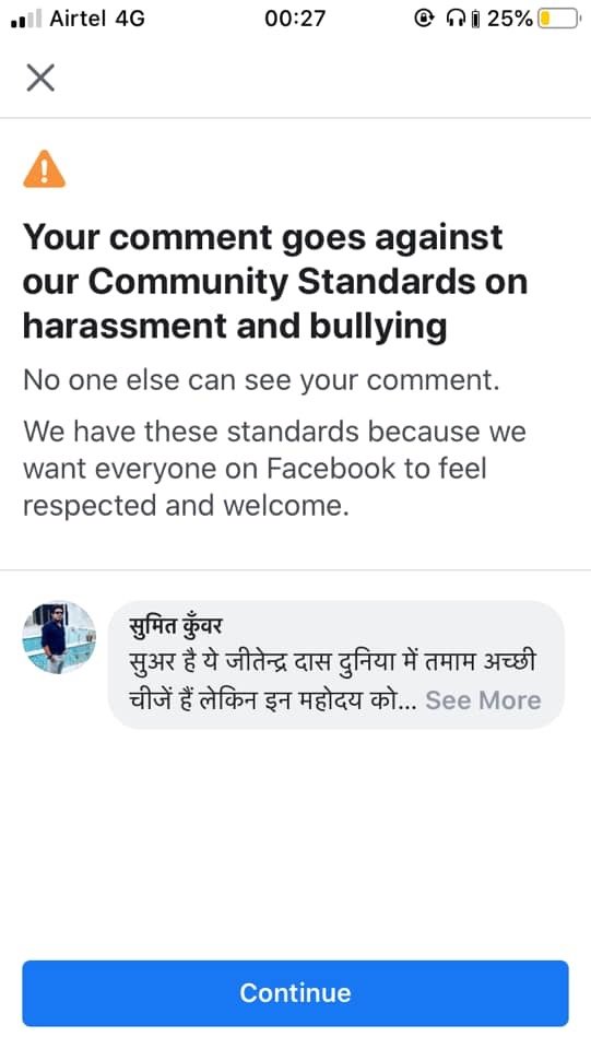 एक यूजर सुमित ने किसी को ‘सूअर’ कह कर गाली दी। वो व्यक्ति मुस्लिम नहीं था जिससे लगे कि उसके मजहब को निशाना बनाया जा रहा है। फेसबुक ने उसे भी सस्पेंड कर दिया। मैं गाली को डिफेंड नहीं कर रहा, लेकिन मुझे नहीं लगता फेसबुक के पास इतनी शक्ति है कि वो गालियों को अपने प्लेटफॉर्म से हटा दे। गाली देना बहुत आम बात है, और अधिकांश लोग देते हैं। फेसबुक बेशक, अगर उसे पादरीगीरी करनी है, तो हर ‘फक’ और ‘शिट’ को हटा दे, और पोप के प्रवचन चलाया करे, लेकिन इसके लिए अकाउंट सस्पेंड करना, समझ से बाहर है।