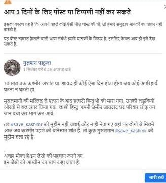 एक यूजर तरुण कुमार ने अल्लामा इकबाल और ‘सारे जहाँ से अच्छा’ गीत के बारे में कुछ लिखा था जिसमें बताया गया था कि इकबाल जैसे लोगों को दार्शनिक कहा गया जबकि उसका पूरा दर्शन दूसरे धर्म के खिलाफ घृणा फैलाने पर आधारित था। इसके साथ ही इस्लामी जिहाद और कट्टरपंथ की बात की गई थी। ये आज के दौर की सच्चाई है। पोस्ट में सच लिखा गया था और कहीं से भी किसी को भड़काने की बात नहीं थी, लेकिन फेसबुक ने उसे हटावाया और प्रतिबंध लगा दिया।