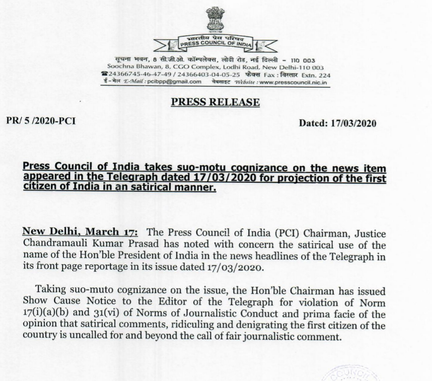 भारतीय प्रेस परिषद ने बंगाल से छपने वाले वामी अखबार ‘द टेलीग्राफ’ को कारण बताओ नोटिस जारी किया। द टेलीग्राफ को ये नोटिस राष्ट्रपति के नाम की तुलना कोरोना वायरस के साथ करने के कारण दिया गया। मंगलवार (मार्च 17, 2020) को जारी प्रेस रिलीज के अनुसार परिषद ने 17 मार्च 2020 को अखबार में प्रकाशित हुई एक हेडलाइन पर संज्ञान लेते हुए ये एक्शन लिया।इस हेडलाइन में वामी समाचार पत्र ने ‘व्यंग्यात्मक’ शैली का इस्तेमाल करते हुए नियमों का उल्लंघन किया था। जिसके बाद पत्रकारिता नियमों के उल्लंघन के आरोप में ये नोटिस जारी किया गया।