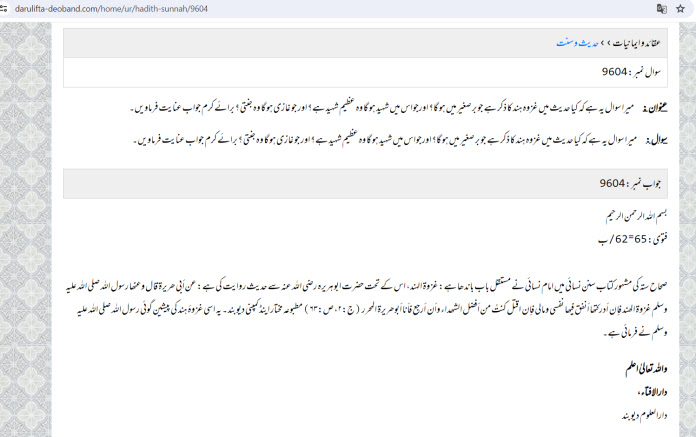 darulifta-deoband.com पर उर्दू में पूछा गया प्रश्न और उसका जवाबइसी सवाल के जवाब में दारुल उलूम की ओर से फतवा जारी किया गया। फतवे में ‘सुन्न अल नसा (Sunan-al-Nasa) ‘ नाम की किताब का जिक्र करते हुए कहा गया है कि इस किताब में गजवा-ए-हिंद को लेकर पूरा का पूरा चैप्टर है। इसमें हजरत अबू हुरैरा की हदीस का जिक्र करते हुए कहा गया है- “अल्लाह के संदेशवाहक ने भारत पर हमले का वादा किया था। उन्होंने कहा था कि अगर मैं जिंदा रहा तो इसके लिए मैं अपनी खुद की और अपनी संपत्ति की कुर्बानी दे दूँगा। मैं सबसे महान शहीद बनूँगा।”